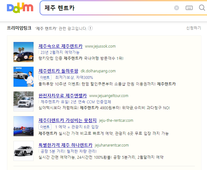 저희가 다음이나 네이버에서 제주렌트카를 검색 하다보면, 이렇게 많은 광고들이 나옵니다. 물론 메이저 렌트카인 AJ라던지 기타 메이저 업체들에서 받는 것도 신뢰성에서는 도움이 되겠지만, 이런 곳은 가격비교를 하다보면 다른 업체들에 비해 다소 비싸다는 것을 느끼실 수 있을거에요.