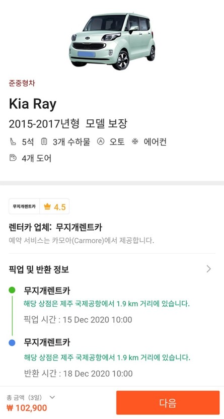 이건 제 경험담인데, 제가 2달 전에 계획 했을 때 레이가 4박 5일에 약 12만원 정도였어요. 그렇게 예약을 미루고 미루다 3일 전에 예약하려니까 차는 없을 뿐더러 간신히 특가로 나온 걸로해서 소나타를 35만원에 빌릴 수 밖에 없었죠... ㅠㅠ 일정이 다 정해져 있고, 큰 변동이 없으시다면, 예약금만 걸어놓으면 되기 때문에 가능한 빠르게 차종을 예약하시는 것을 추천드립니다!