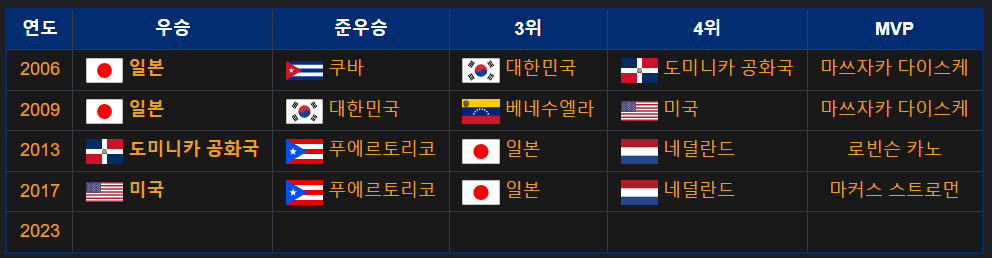 2006년 2009년에는 일본이 차지했고, 2013년에는 도미니카 공화국, 2017년에는 미국이 차지했네요.