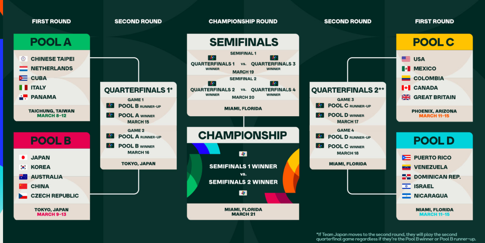 Pool B 1위 : Pool A 2위 -> 도쿄돔 Pool D 1위 : Pool C 2위 -> 마이애미 론디포 파크